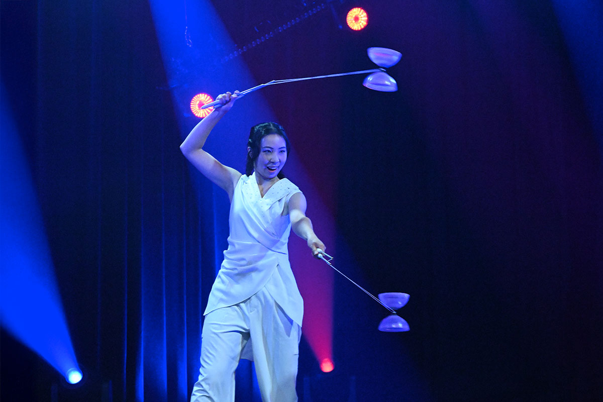 Mit ihrer atemberaubenden Diabolo-Kunst in einzigartig romantischer und gelichwohl kraftvoller Form zeigt Hilary wieder und wieder eine wahrhaft beeindruckende Leistung! Die innovative und moderne Interpretation dieses Genres verkörpert die chinesische Küntslerin auf ihre eigene, wirklich faszinierende Weise - auch das Publkum beim Nachwuchsfestival European Youth Circus Festival in Wiesbaden war 2024 so begeistert, dass Hilary den Publikumspreis gewann und heute lebt sie ihren Traum auf internationalen Bühnen zu performen!
