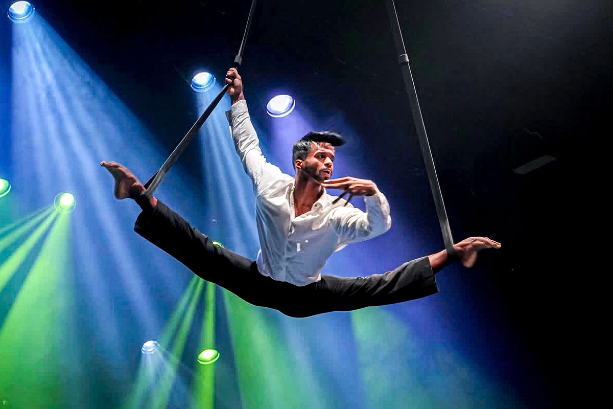 An den Strapaten hebt er scheinbar mühelos die Gesetze der Schwerkraft auf und lässt in seiner zweiten Darbietung wortwörtlich die Welt kopfstehen – wenn er mit seinen Handständen Bilder kreiert, die Ausdruck purer Eleganz zund akrobatischer Exzellenz zeigen. Eine perfekte Symbiose aus Dynamik und Ästhetik!