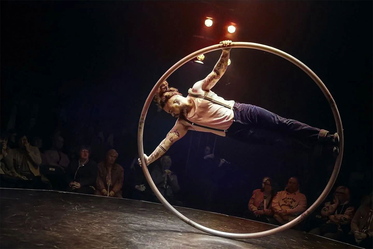 Mit einem Höchstmaß von Kraft, Konzentration und akrobatischem Können, zeigt der ukrainische Künstler Jeka eine Darbietung im 15 Kilo schweren Mono-Rad am Boden und lässt dabei Contemporary Tanz, Balance, Dynamik und Artistik verschmelzen. Dafür gewann der junge Autodidakt im Jahr 2022 beim Festival Cyrkulacje in Lublin die Bronze Medaille. Aber er ist nicht nur hervorragend im Cyr Wheel! Völlig schwerelos zeigt er sich auch am Flying Pole in der Luft.